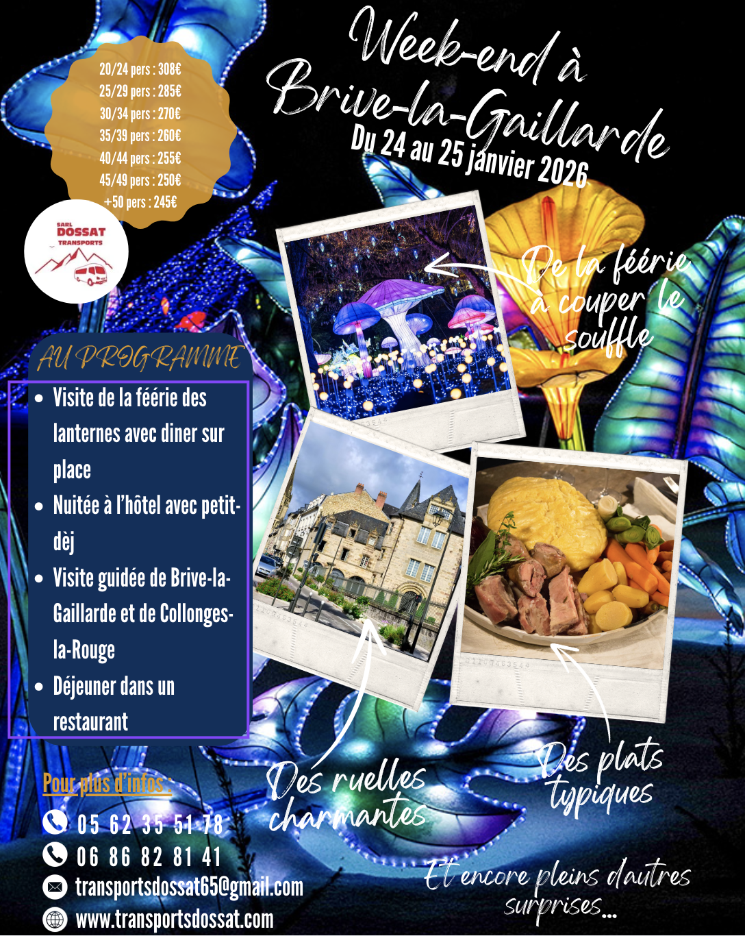 SortiesConcours de belote 18/01/2026 à BONNEFONTInscription 8€ sur place à partir de 13h Nombreux lots à gagner Buvette, crêpes COMITE DES FETES Animation locale Associative ou civique Les 30 ans des Hivernales![]() 23/01/2026 à PUYDARRIEUXCe festival Nature & Environnement est ouvert à toutes et à tous : jeunes ou moins jeunes, naturalistes, curieux, en solo ou entre amis, avec votre association ou groupe naturaliste Venez vous émerveiller dans une ambiance chaleureuse et conviviale dans les locaux de la Maison de la Nature et l'Environnement des Hautes-Pyrénées ! Cette année est sous le thème de l'Agroécologie ! Conférences, expositions, films, ateliers (enfants et adultes), sorties et soirées vous attendent à Puydarrieux Hébergement sur place dès le vendredi Restauration tout le week-end MAISON DE LA NATURE ET DE L'ENVIRONNEMENT Atelier - Conférence - Démonstration - Initiation - Exposition - Festival - Repas Animaux - Développement durable - Fleurs Plantes Découverte - Sensibilisation - Environnement - Nature et détente - Patrimoine Tél filaire 05 62 33 61 66 Site internet: http://www.maisondelanature65.com Concert Nouvel An 24/01/2026 à TRIE-SUR-BAISEL'ensemble d'Accordéon de Capvern, direction Didier Médaillon et la Société Philharmonique de Trie sous la direction de Pierric Féral Au Monastère des Carmes SOCIETE PHILHARMONIQUE Concert Musique concours lièvre renard chevreuil 24/01/2026 à SADOURNINAFACCC65 Associative ou civique - Sports et loisirs Week-end à Brive-la-Gaillarde 24/01/2026 à CASTELNAU-MAGNOACVisite de la féérie des lanternes avec diner sur place Nuitée à l'hôtel avec petit-déj Visite guidée de Brive-la-Gaillarde et de Collongues-la-Rouge Déjeuner dans un restaurant TRANSPORTS DOSSAT Repas - Visite guidée Tél cellulaire 05 62 35 51 78 Tél cellulaire 06 86 82 81 41 Site internet: https://transportsdossat.com/ Lire la suite → |