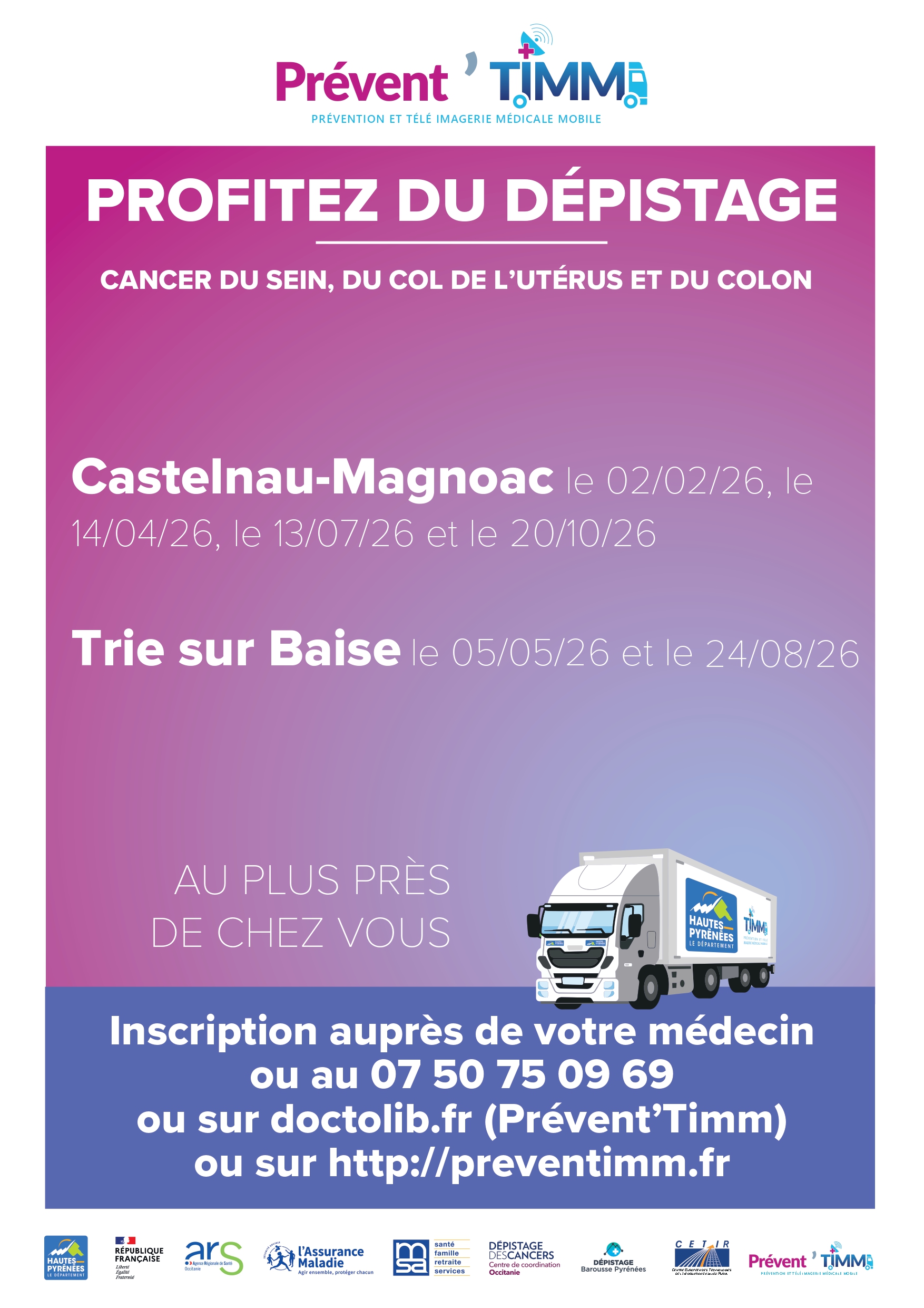 SortiesCours d'histoire de l'art11/03/2026 à TRIE-SUR-BAISE Gaël professeur de design graphique, propose une série de cours d'histoire de l'art ouverts à toutes et à tous, curieux, passionnés ou simples amateurs souhaitant enrichir leur regard Chaque rencontre durera 1 heure à peu près Ces cours permettront de découvrir les grandes périodes artistiques, les mouvements majeurs ainsi que des artistes incontournables ou plus méconnus L'objectif : mieux comprendre les oeuvres, développer son regard critique et partager un moment convivial autour de l'art Les séances sont gratuites, inscription sur place Animation locale Culturelle - Découverte - Sensibilisation Halte aux douleurs articulaires 24/03/2026 à TRIE-SUR-BAISEInscription gratuite Trie-sur-Baïse Département et CCPTM et Mairie Atelier Associative ou civique - Nature et détente - Santé - Forme Le rendez-vous des futurs mariés à la Ferme Auberge du Lac![]() ![]() 11/04/2026 à PUYDARRIEUX1er nouveautés de la saison Nous vous annonçons notre première édition LE RENDEZ-VOUS DES FUTURS MARIES LES 11 ET 12 AVRIL prochain Vous pourrez ainsi voir la ferme auberge en mode mariage et aurez l occasion de faire connaissance avec différents prestataires On vous attend nombreux Entrée gratuite FERME AUBERGE DU LAC Manifestation commerciale Tél filaire 06 71 60 02 29 Vide greniers 12/04/2026 à TRIE-SUR-BAISEAPE DE TRIE Animation locale - Vide greniers Braderie Associative ou civique Camion Dépistage Cancer du sein, de l'utérus et du colon![]() 14/04/2026 à CASTELNAU-MAGNOACInscription auprès de votre médecin ou au 07 50 75 09 69 ou sur les sites PREVENT TIMM Vide greniers Braderie Santé - Forme Tél cellulaire 07 50 75 09 69 Site internet: http://preventimm.fr Lire la suite → |