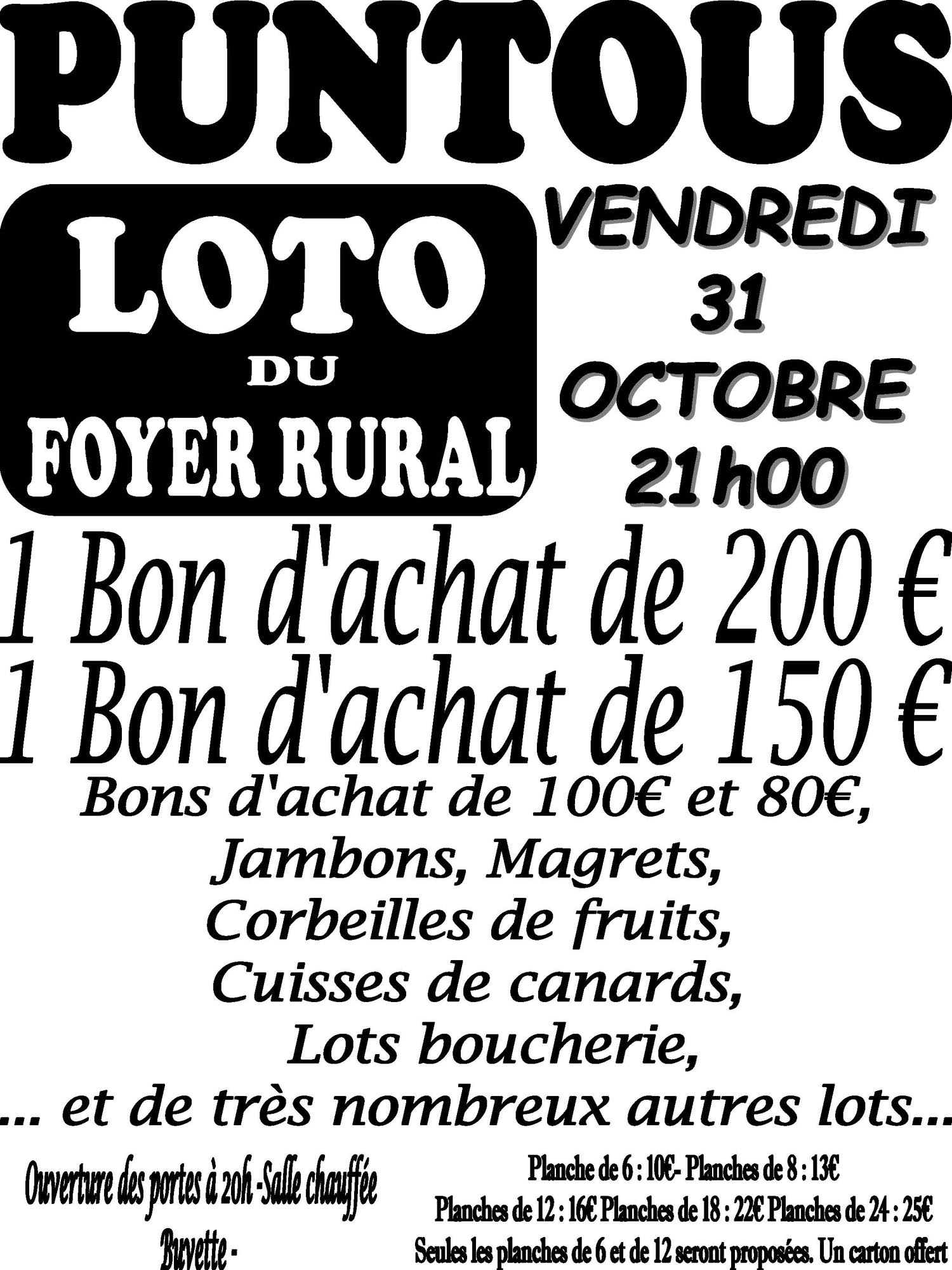 SortiesCalendrier des Messes 01/10/2025 à TRIE-SUR-BAISEENSEMBLE PAROISSIAL Religieuse Mois des familles 10/10/2025 à CASTELNAU-MAGNOACActivités, contes, ateliers, etc CCPTM Animation locale - Atelier Pour enfant Culturelle - Découverte - Sensibilisation Brocante des Halles![]() Marché à la brocante de professionnels Restauration rapide Entrée gratuite ANTRIQUITES Brocante Manifestation commerciale Tél cellulaire 06 42 87 00 05 Tél cellulaire 06 70 25 32 90 Micro Bibli & Ecran géant 29/10/2025 à LALANNE-TRIEProjection du film d’animation L’ODYSSÉE DE CHOUM, précédée de la lecture de courtes histoires par l’association La Garouste et sa Micro Bibli CINEMA LE LALANO - MAISON DE LA COMMUNICATION Cinéma Culturelle Tél cellulaire 06 87 97 35 51 Tél filaire 09 63 45 26 25 Site internet: http://lelalano.fr/ Halloween 31/10/2025 à TRIE-SUR-BAISE19h30 à 22h ouvert à tous les enfants de 3/11 ans sous la responsabilité des parents Venez déguisés à la Maison Enfance Jeunesse fermeture des entrées à 21h SERVICE ENFANCE JEUNESSE CCPTM Pour enfant Associative ou civique Tél cellulaire 05 62 50 02 78 Lire la suite → |