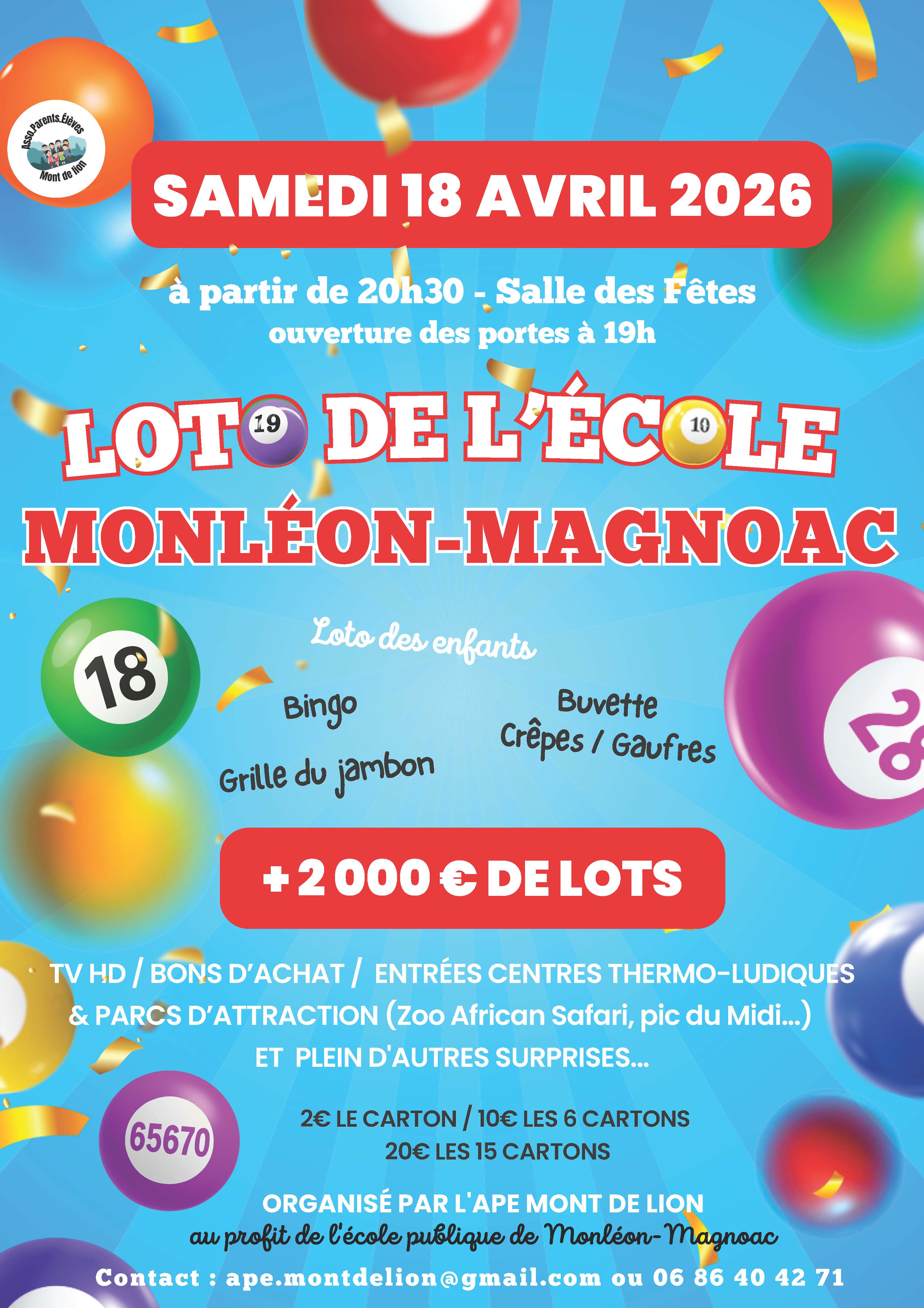 SortiesCours d'histoire de l'art11/03/2026 à TRIE-SUR-BAISE Gaël professeur de design graphique, propose une série de cours d'histoire de l'art ouverts à toutes et à tous, curieux, passionnés ou simples amateurs souhaitant enrichir leur regard Chaque rencontre durera 1 heure à peu près Ces cours permettront de découvrir les grandes périodes artistiques, les mouvements majeurs ainsi que des artistes incontournables ou plus méconnus L'objectif : mieux comprendre les oeuvres, développer son regard critique et partager un moment convivial autour de l'art Les séances sont gratuites, inscription sur place Animation locale Culturelle - Découverte - Sensibilisation Halte aux douleurs articulaires 24/03/2026 à TRIE-SUR-BAISEInscription gratuite Trie-sur-Baïse Département et CCPTM et Mairie Atelier Associative ou civique - Nature et détente - Santé - Forme Agroécologie : Troc de graines et de plants 18/04/2026 à PUYDARRIEUXà la MNE 65 pour un après-midi autour de l'Agroécologie : Troc de graines et de plants, des animations en lien avec le monde végétal vous seront également proposées (initiation vannerie, balade autour des plantes du jardin, stand herboristerie) Gratuit sans inscription MAISON DE LA NATURE ET DE L'ENVIRONNEMENT Animation locale Découverte - Sensibilisation - Environnement - Nature et détente Tél filaire 05 62 33 61 66 Site internet: http://www.maisondelanature65.com Loto de l'école 18/04/2026 à MONLEON-MAGNOACAPE MONT DE LION Animation locale Loto Associative ou civique Tél cellulaire 06 81 53 19 66 Journée Shopping au Pas de la Case 18/04/2026 à CASTELNAU-MAGNOACProfitez d’une journée libre au cœur des Pyrénées pour faire le plein de bonnes affaires dans les boutiques andorranes ! Départ de Trie-sur-Baise à 6h10 Départ de Castelnau-Magnoac à 6h30 Départ de Lannemezan à 7h00 En autocar de tourisme – Confort et convivialité garantis ! Une pause sera prévue en cours de route pour bien démarrer la journée Journée libre au Pas de la Case À vous les parfums, vêtements, électronique et produits détaxés ! Restaurants, bars, terrasses : profitez de votre temps libre à votre rythme, seul(e), en famille ou entre amis Retour prévu à 15h00 – Départ du Pas de la Case pour Castelnau-Magnoac Tarif dégressif selon le nombre d’inscrits : 25 à 29 personnes : 42€ 30 à 34 personnes : 39€ 35 à 39 personnes : 36€ À partir de 40 personnes : 33€ Le prix comprend : Le trajet aller-retour en autocar de tourisme Ne comprend pas : repas, achats personnels, dépenses sur place Réservez vite votre place pour cette escapade shopping à prix malin ! Une belle occasion de faire des économies… tout en prenant un bon bol d’air de montagne ! TRANSPORTS DOSSAT Manifestation commerciale Tél filaire 05 62 35 51 78 Tél cellulaire 06 86 82 81 41 Site internet: https://transportsdossat.com/ Lire la suite → |